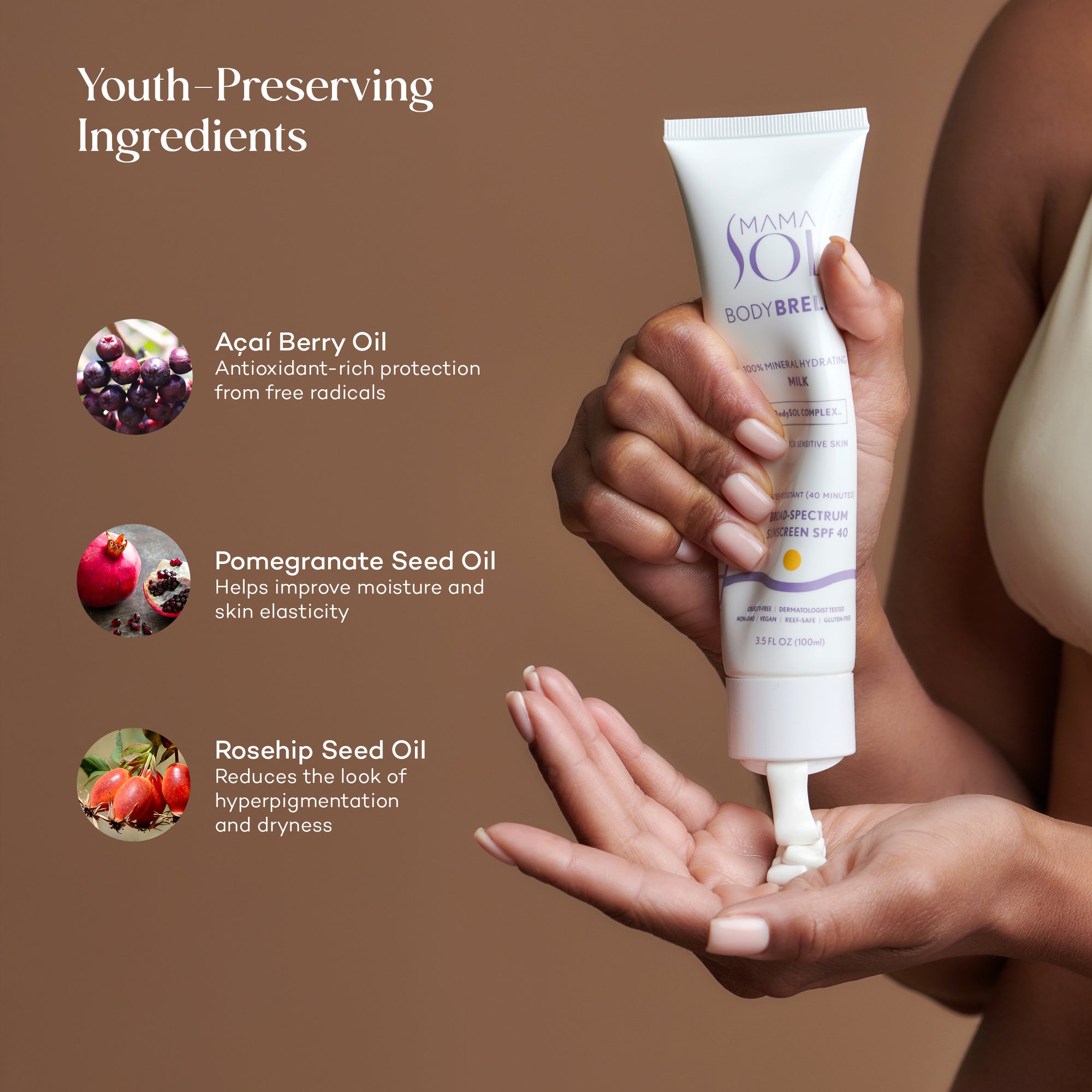 BodySOL Complex™ infuses Pomegranate, Tamanu, Rosehip, and Acai Berry Oils to moisturize, nourish and smooth the look of skin and reduce the appearance of hyperpigmentation.